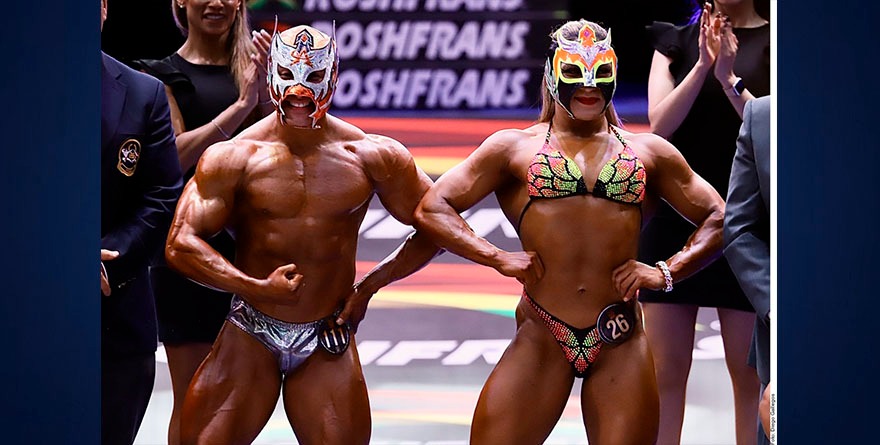 Astral y Olympia, celebraron sus victorias con un emotivo beso en el ring, en el torneo del CMLL de fisicoculturismo.