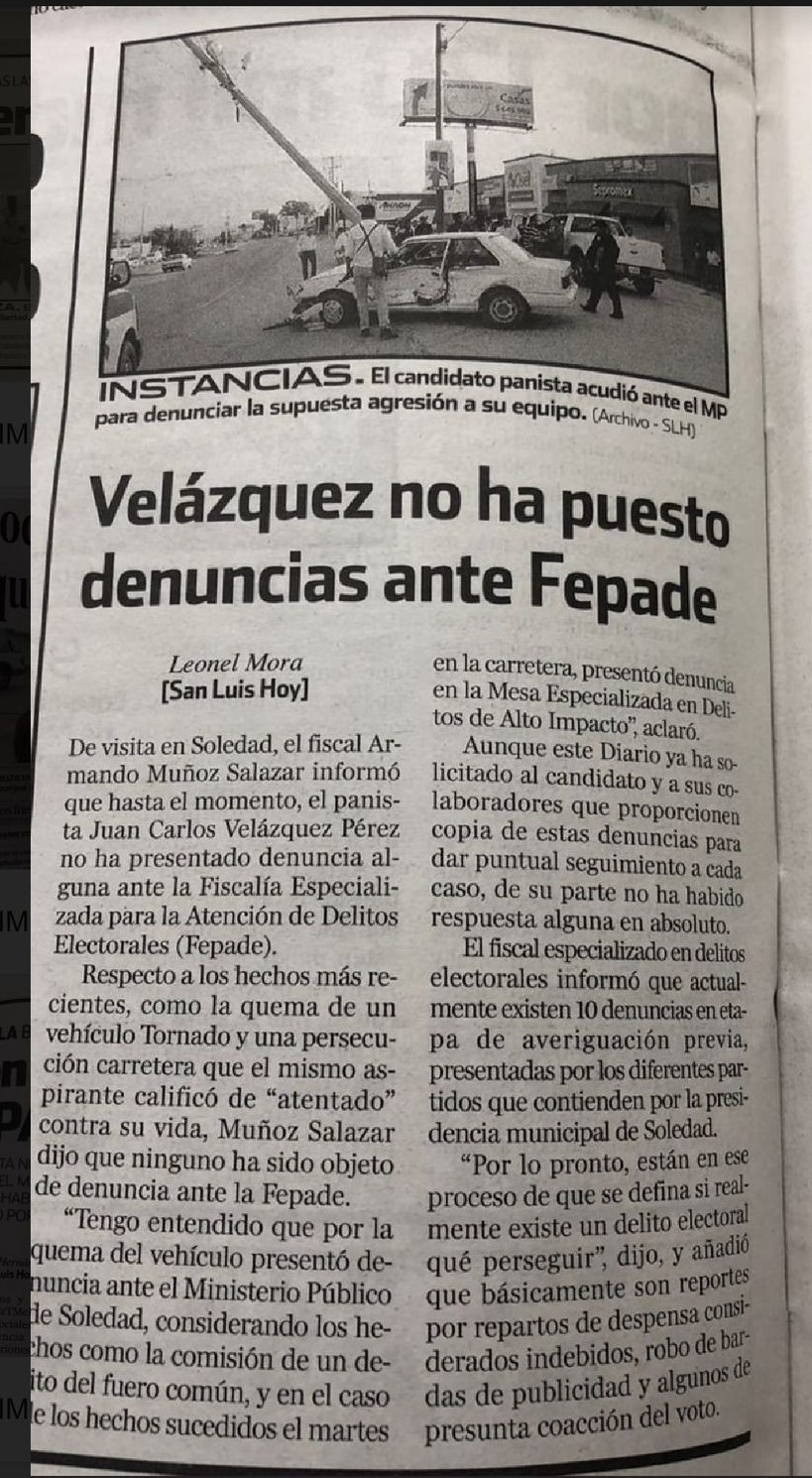 Igualmente, en San Luis Hoy, Leonel Mora escribió en su nota: “El fiscal Armando Muñoz Salazar, informó que hasta el momento, el panista Juan Carlos Velázquez Pérez, no ha presentado denuncia alguna ante la fiscalía especializada por la atención de delitos electorales (FEPADE).