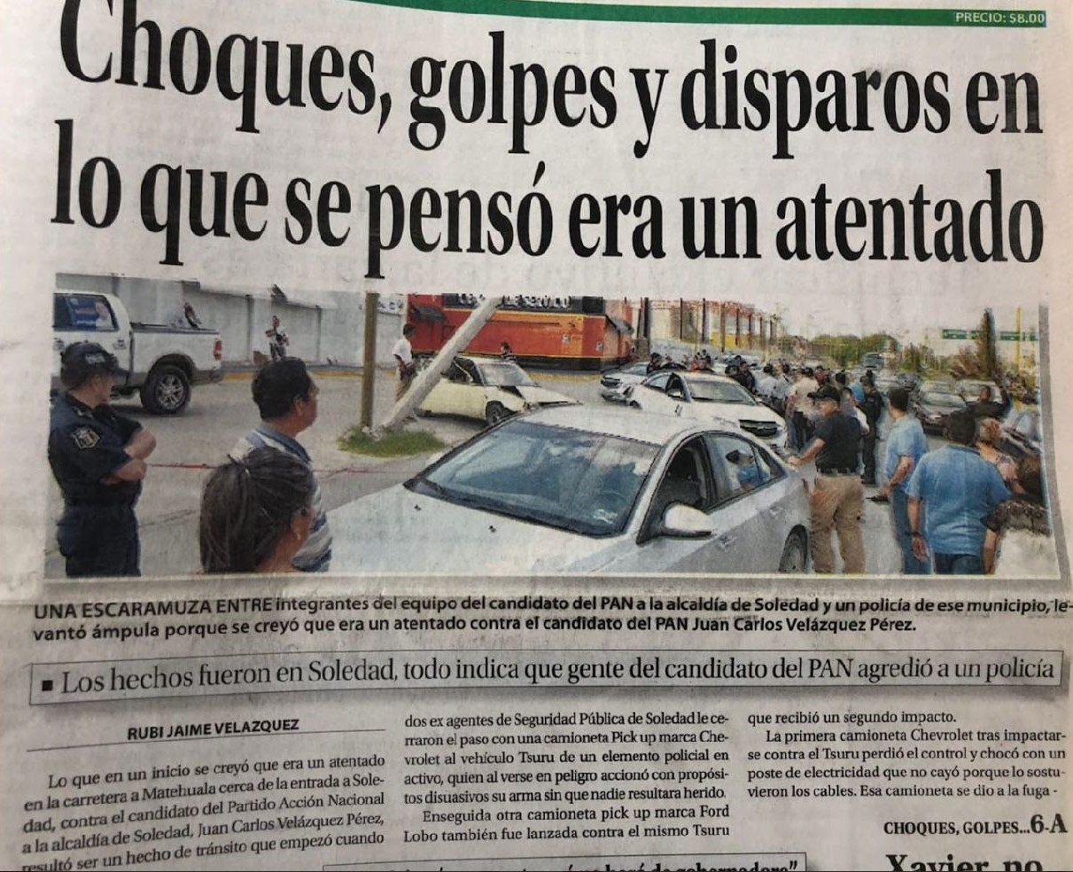 Las evidencias bibliográficas dan cuenta de hechos ocurridos en mayo del 2015.  En una nota firmada por Rubí Jaime Velázquez, escribe: “Escaramuza entre los integrantes del equipo del candidato del PAN a la alcaldía de Soledad, y un policía del municipio, levantaron ámpula porque creyó que era un atentado contra el candidato del PAN, Juan Carlos Velázquez”, dice la nota.