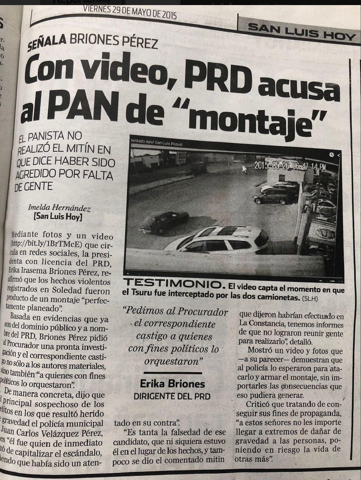 Por su parte, Ismael Hernández escribe en San Luis Hoy, PRD amenaza al PAN de montaje, la dirigente estatal Erika Briones, del PRD en San Luis declaró: “Los hechos violentos registrados en Soledad fueron producto de un montaje planeado”.
