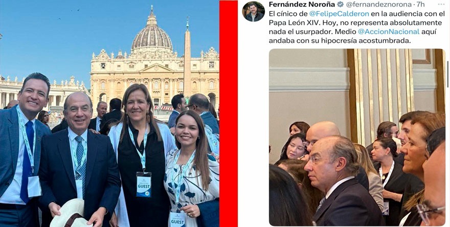 «El cínico de Felipe Calderón en la audiencia con el Papa León XVI. Hoy no representa absolutamente nada el usurpador. Medio Acción Nacional aquí andaba con su hipocresía acostumbrada», posteó Fernández Noroña.