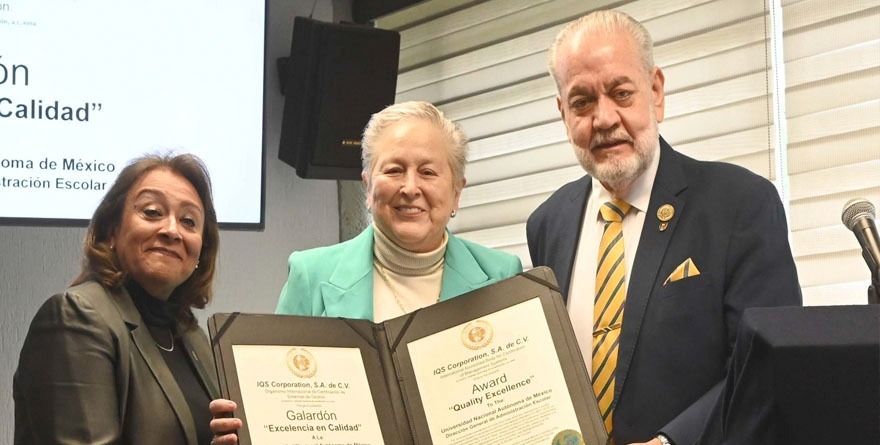 Ciudad Universitaria, CDMX, 30 junio 2025.- La Dirección General de Administración Escolar (DGAE) de la UNAM mereció el Galardón Excelencia en Calidad que otorga el Organismo Internacional de Certificación de Sistemas de Gestión, IQS Corporation, S.A. de C.V.