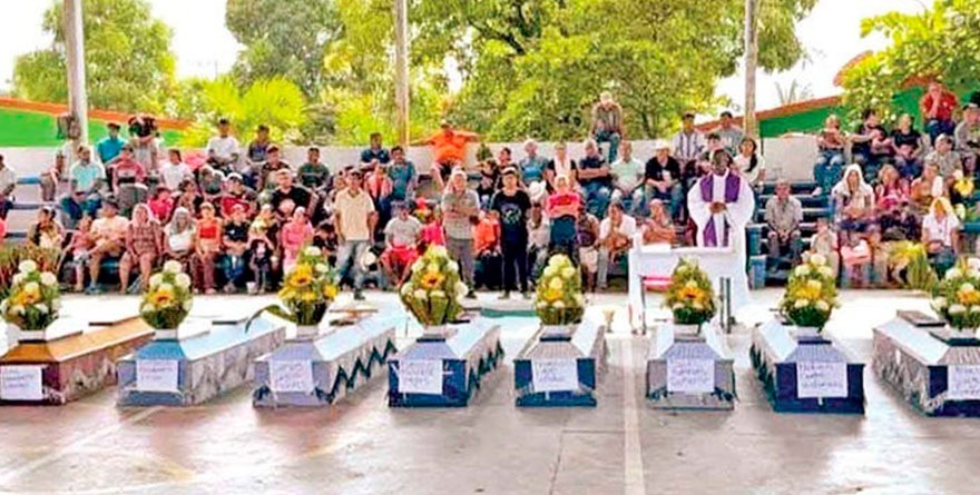 Los ataúdes con los cuerpos de los ocho policías comunitarios fueron colocados ayer en la cancha municipal de El Cortijo, donde pobladores les organizaron una misa y un homenaje. Horas después fueron enterrados.