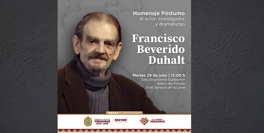 Xalapa, Ver., martes 29 de julio de 2025.- La Secretaría de Cultura de Veracruz (SECVER) lamenta profundamente el fallecimiento de Francisco Beverido Duhalt, destacado actor, director, productor, dramaturgo, profesor e investigador de las artes escénicas en Veracruz. Para honrar su legado, hoy a las 12:00 horas, se llevará a cabo un homenaje póstumo en la Sala Dagoberto Guillaumin del Teatro del Estado General Ignacio de la Llave.