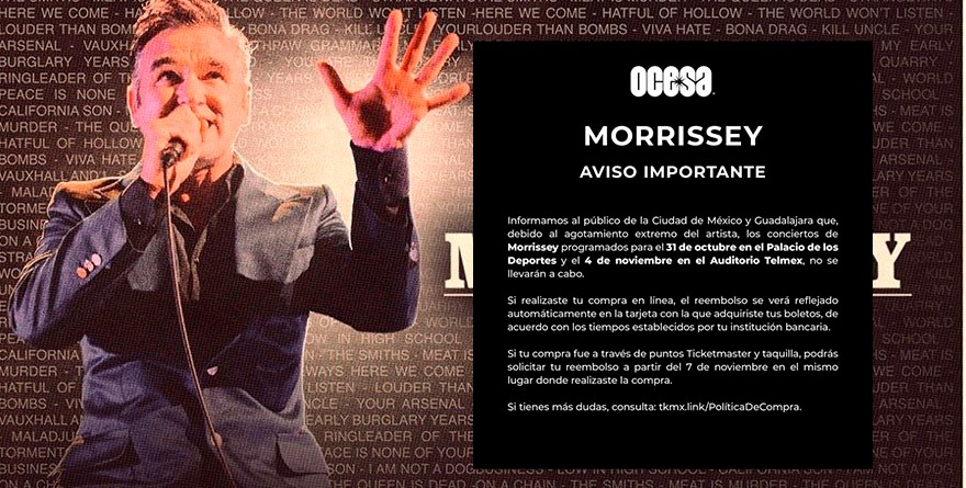 A solo unas horas de su primera presentación en el Palacio de los Deportes, el cantante británico Morrissey volvió a cancelar sus conciertos programados para el 31 de octubre y 4 de noviembre en la Ciudad de México, argumentando “agotamiento extremo”.