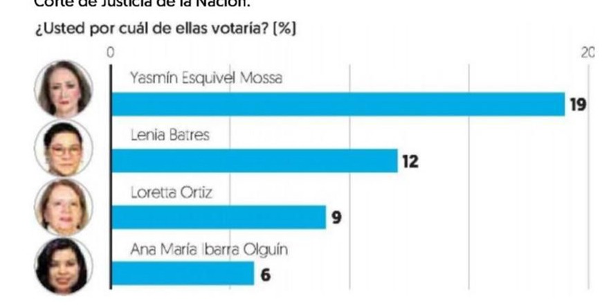 De acuerdo con la encuesta publicada este lunes por El Financiero, titulada Elección judicial: Lideran Esquivel, Batres y Ortiz para la SCJN, la candidata que lleva