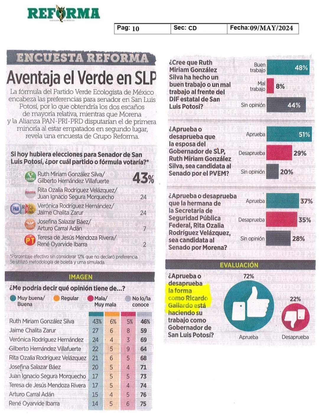 Con el título “Aventaja el Verde en SLP”, Grupo Reforma pronostica un triunfa avasallador a la fórmula del Partido Verde rumbo al Senado encabezada por Ruth González y su compañero de fórmula Gilberto Hernández Villafuerte.