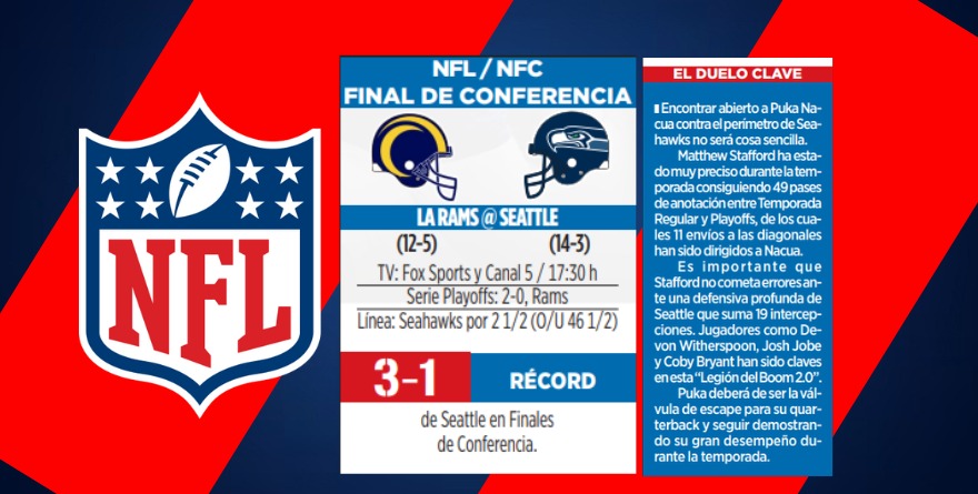 La Final de la NFC será testigo del tercer choque de la campaña entre Rams y Seahawks -reparten una victoria por bando-. Seattle se llevó Oeste de la Nacional, ganándole la carrera al equipo angelino y a San Francisco, franquicia a la que despachó sin despeinarse en la Ronda Divisional.
