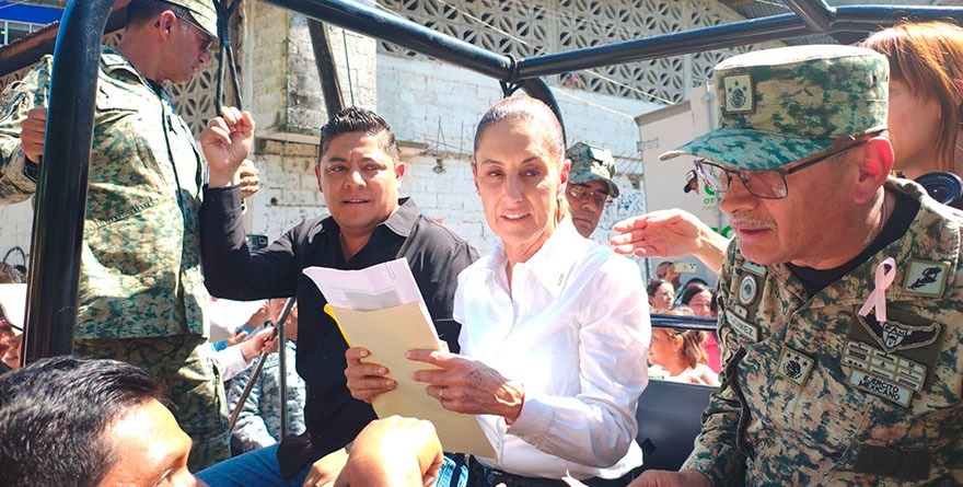 La Presidenta y el Gobernador recorren en un Jeep militar las calles donde han sido recibidos por familias que les agradecen la intervención oportuna ante las inundaciones que afectaron gran parte de la huasteca potosina.