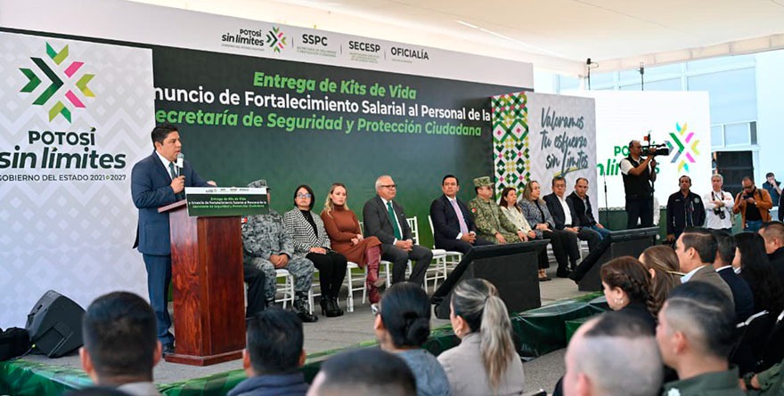 El Gobernador señaló que la meta es convertir, para el 2026, a la Guardia Civil Estatal en la policía mejor pagada de México, con aumentos anuales sostenidos y bonos adicionales para las y los elementos en activo, «el Gobierno del Estado va a cuidar a las familias de quienes cuidan a San Luis Potosí; con este aumento, mejorarán sus ingresos, podrán cubrir colegiaturas, medicinas y asegurar un retiro digno”, expresó.