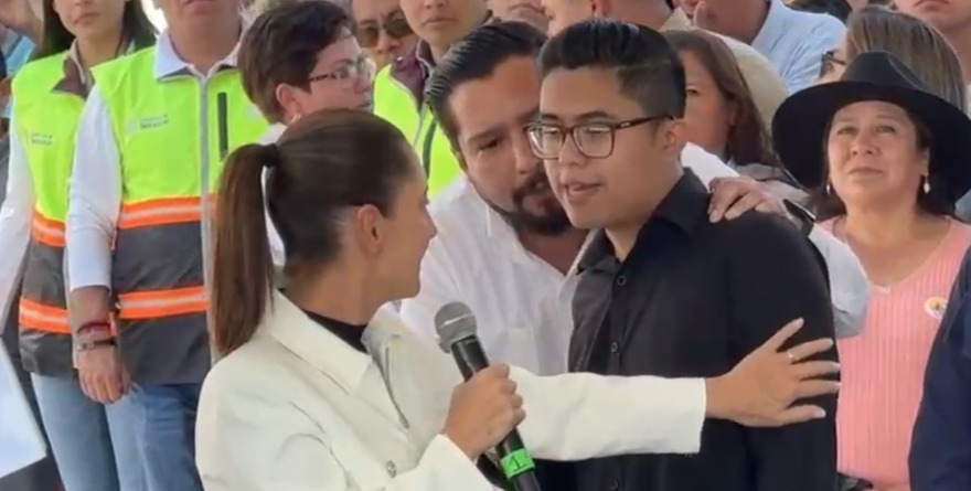 Mientras la Mandataria daba un discurso sobre el derecho a la educación, el joven llegó por detrás, ante el asombro del personal de Ayudantía. «Ahorita te escucho», le insistía Sheinbaum.