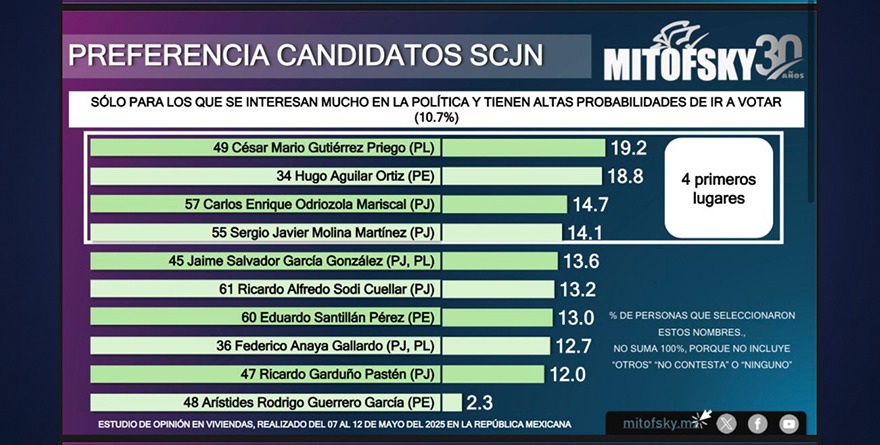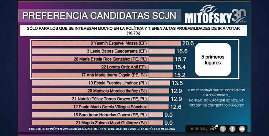 Ciudad de México, 20 mayo 205.- De acuerdo con una encuesta de Mitofsky, Yasmín Esquivel encabeza las preferencias para ministras y ministros de la Suprema Corte de Justicia de la Nación, en la elección a realizarse el domingo 1 de junio.